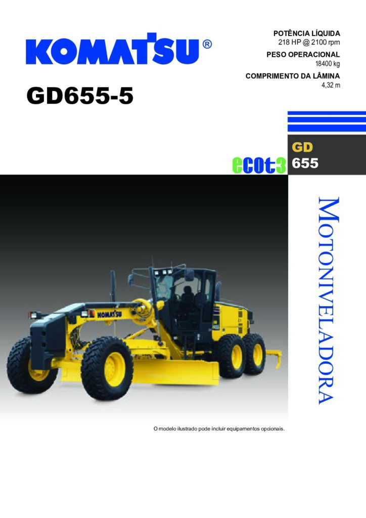 A Motoniveladora Komatsu modelo GD655-5, possui potência de 218 HP, peso operacional de 18,4 toneladas , comprimento da lâmina 4,32 m, cabine ROPS/FOPS fechada com ar-condicionado e nível de ruído reduzido.